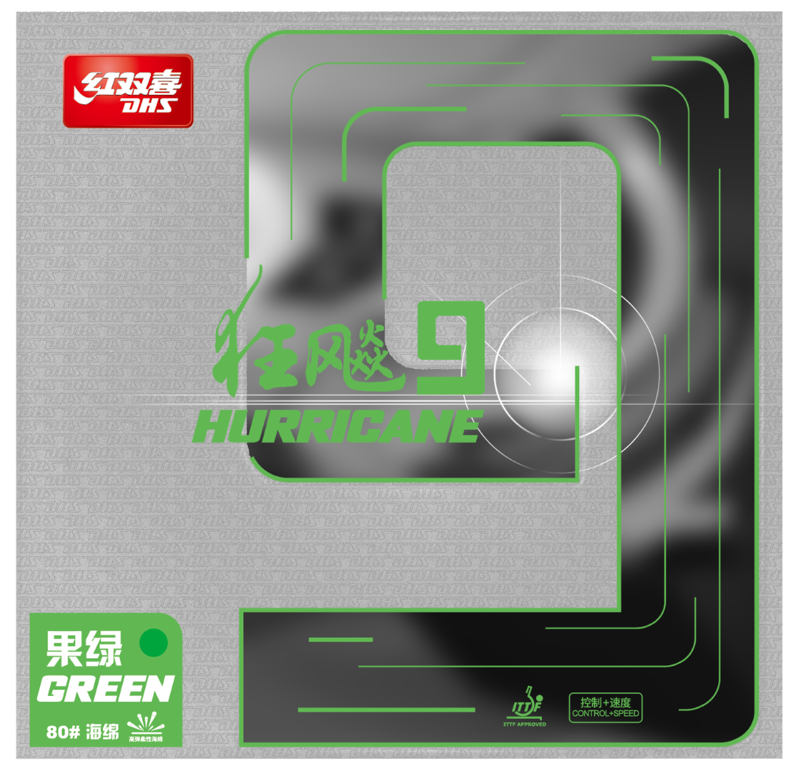 Der Hurricane 9 in lila und grün ist mit einem für chinesische Verhältnisse weichem und hochelastischen, großporigen Schwamm ausgestattet und ist somit ideal für das Allround-orientierte Angriffs-Spiel.